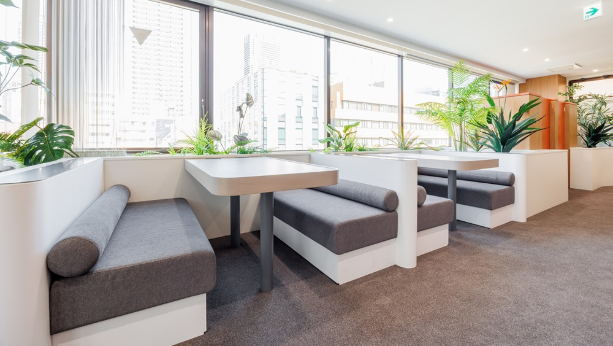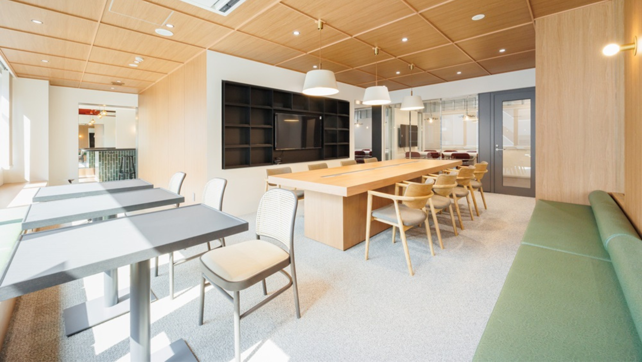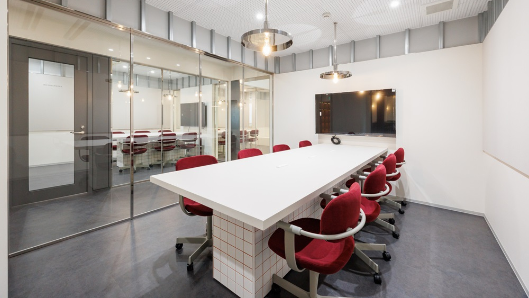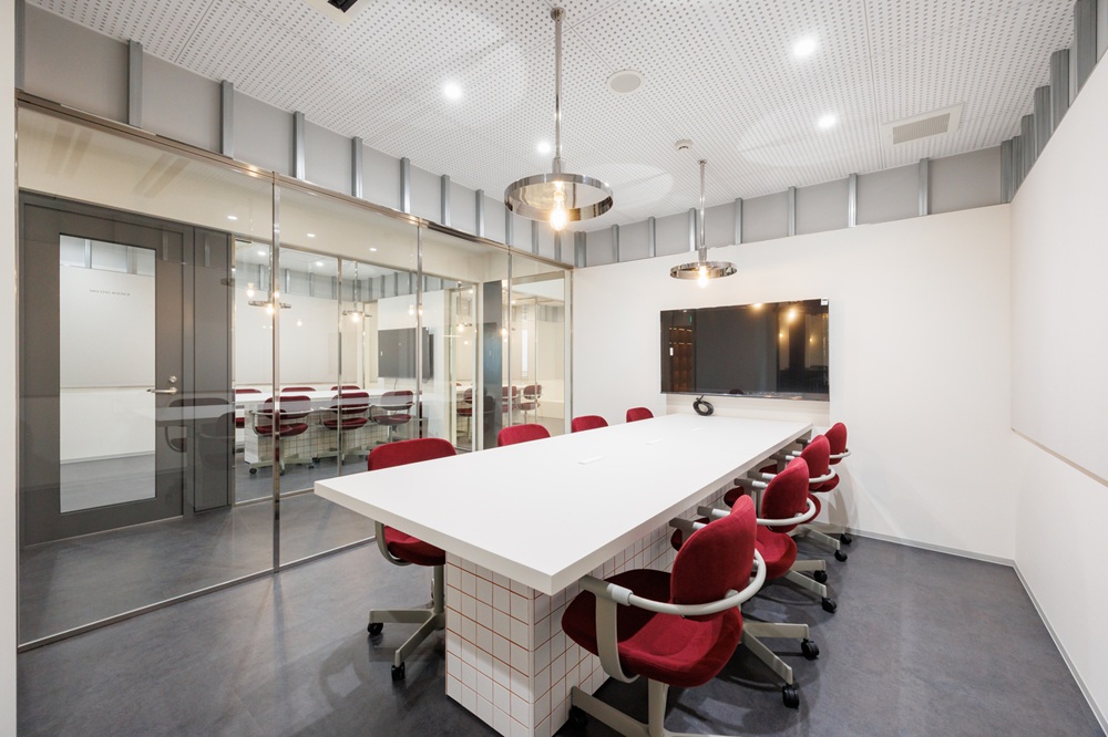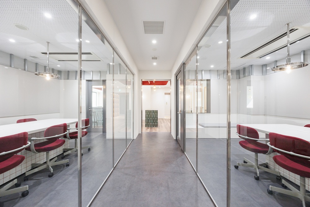 ガラス張りの会議室やガラス張り廊下がありオシャレなオフィスルームです。