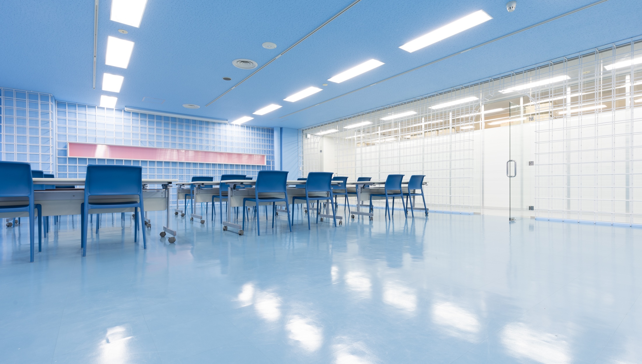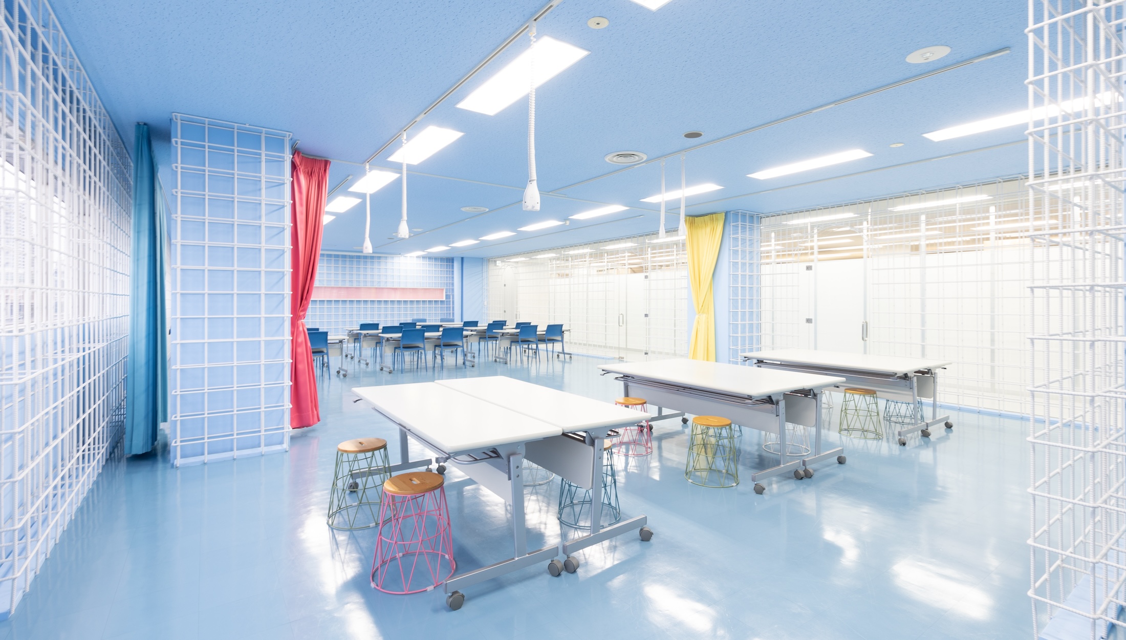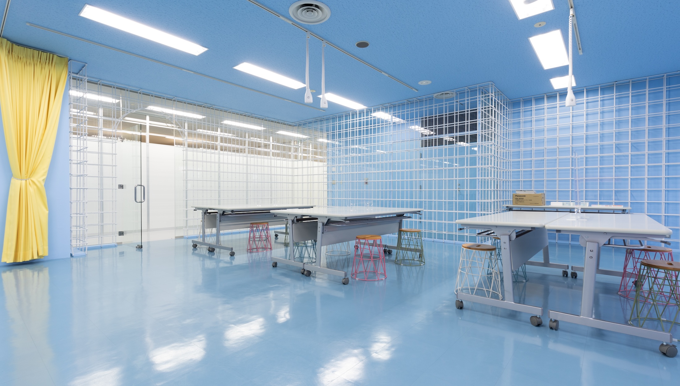 ブルーの壁と格子による区切りで、ただでさえ広い倉庫空間がより広く、開放的に感じられます。
