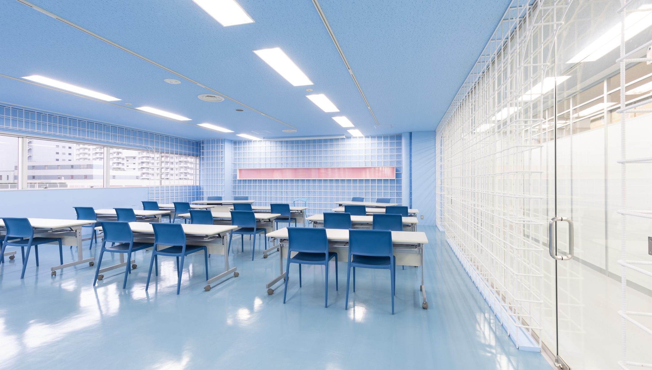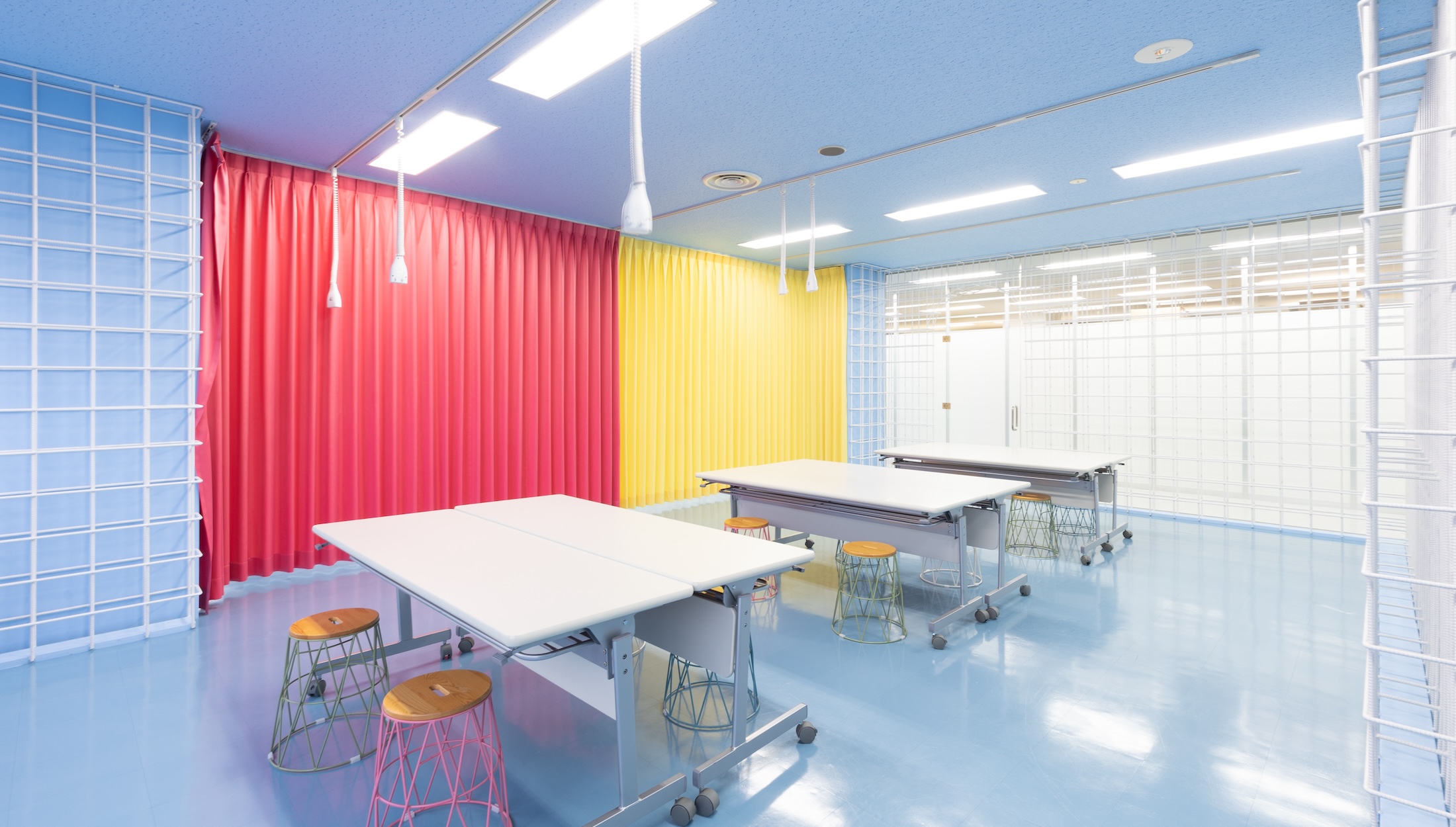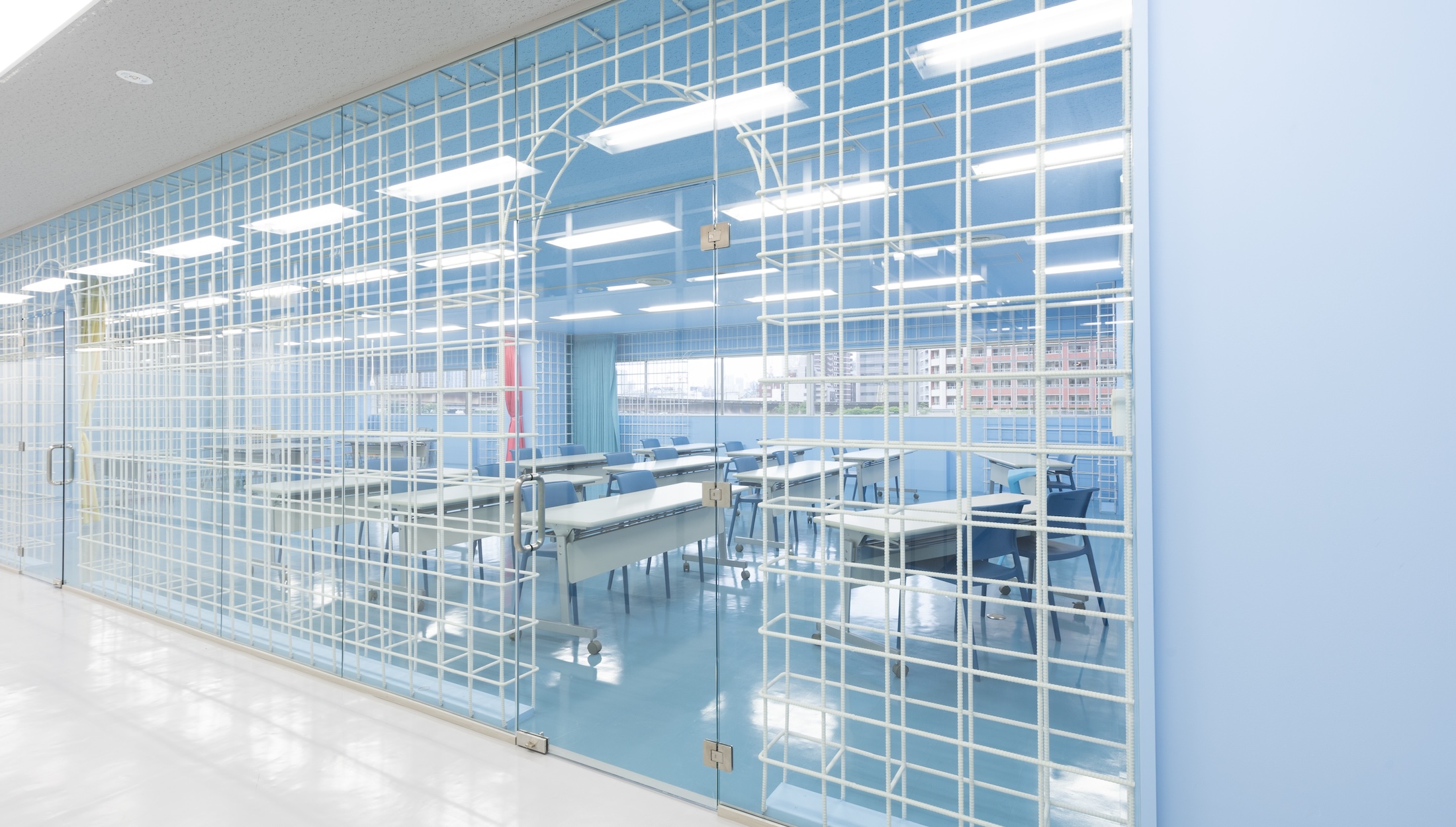 ブルーの壁と格子による区切りで、ただでさえ広い倉庫空間がより広く、開放的に感じられます。